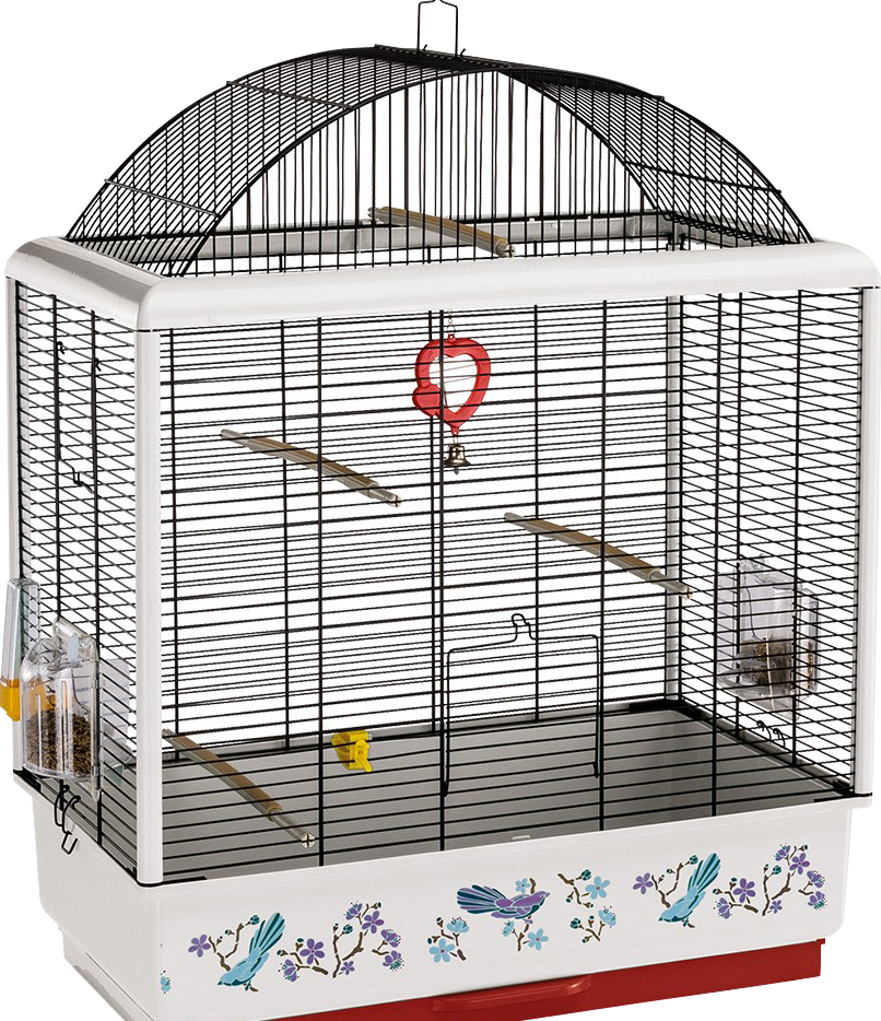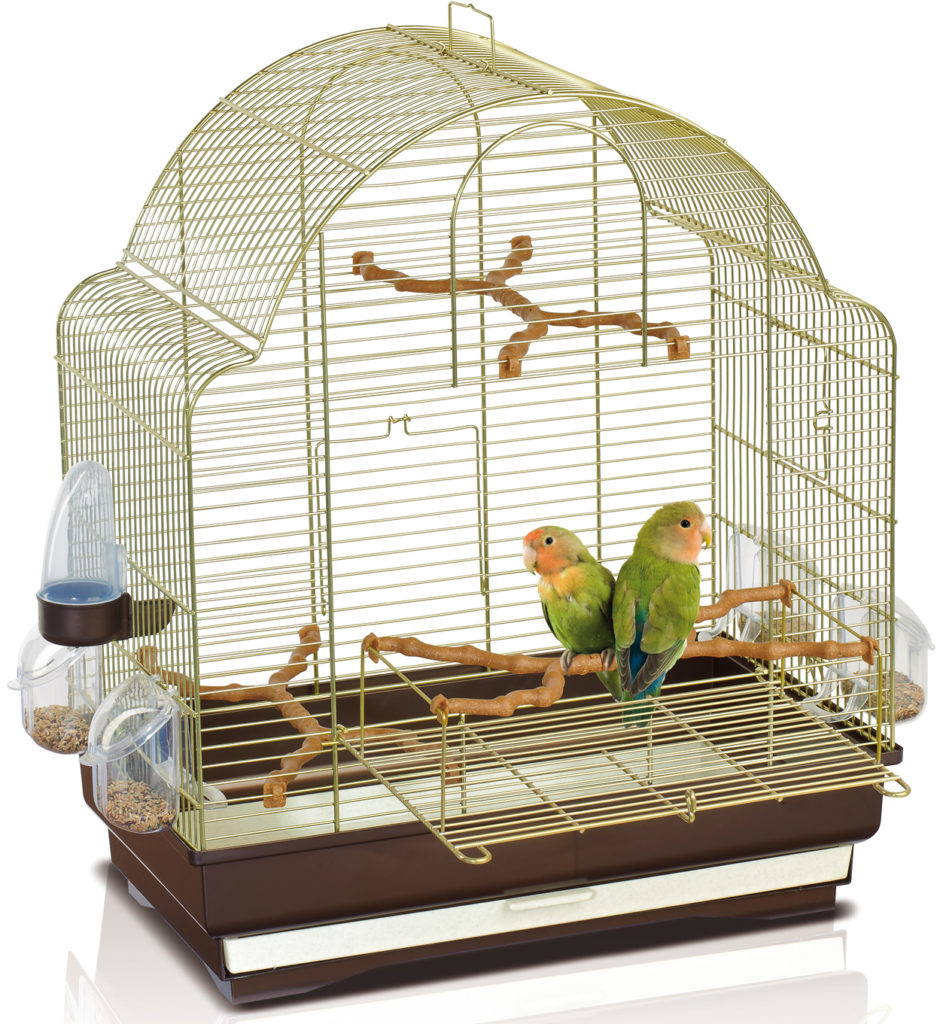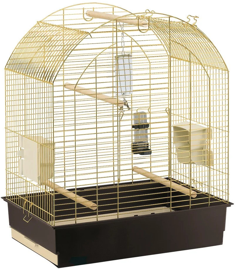 Les produits de cette marque attirent les acheteurs avec leur design riche et beau. La partie métallique du cadre est traitée avec un revêtement doré, sans danger pour la santé des habitants à plumes. Un plateau profond en plastique durable glisse. Son fond est recouvert d'une grille spéciale qui empêche les perroquets d'accéder aux débris. Les dimensions principales de la structure sont les suivantes : longueur - 52 cm, profondeur - 41 cm, hauteur - 59 cm. Les portes disponibles ont les paramètres suivants : grandes - 34,5 cm x 31,5 cm et petites - 10 cm x 9 cm. 5300 roubles. De plus, le cadre contient deux mangeoires et des perchoirs.