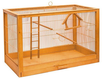 Ces produits se distinguent par leurs grandes dimensions, qui mesurent 69,5 cm de long, 44,5 cm de profondeur et 84 cm de haut.Le coût d'une telle structure est assez élevé - près de 15 000 roubles. Cela est dû non seulement aux grandes dimensions, mais aussi à la qualité des matériaux utilisés. La partie métallique du cadre est constituée d'un fil durable traité avec un revêtement en plastique ou en laiton. Le sommet de la structure s'ouvre, donnant aux oiseaux un certain temps de liberté. Le plateau est rétractable et fabriqué en matériau de couleur ivoire. Accessoires inclus : mangeoire tournante, bouteille d'eau, perchoirs en bois, jouet cloche et miroir.