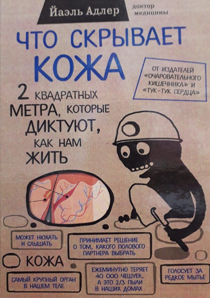 La littérature décrit le rôle de la peau pour l'homme.En outre, le lecteur peut découvrir la structure des organes cachés sous la peau. Le livre indique également les causes du vieillissement cutané, et comment les émotions affectent les cellules de l'épiderme. Le livre est destiné aux lecteurs âgés de 14 ans et plus. Yael Adler est très populaire parmi les lecteurs grâce à ses ouvrages "Intestins charmants", ainsi que "Toc-toc du cœur", dans lesquels vous pouvez en apprendre davantage sur la structure des organes internes et sur le rôle qu'ils jouent dans la vie humaine.