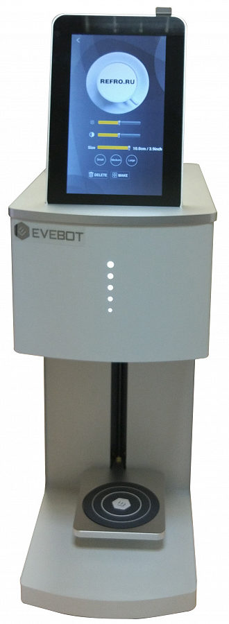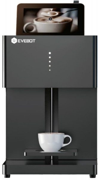 L'imprimante à café couleur EVEBOT est un modèle amélioré des versions précédentes. Les innovations sont une nouvelle carte mère, un mécanisme d'alimentation en encre, la possibilité d'imprimer avec de l'encre de qualité alimentaire avec l'ajout d'extrait de café. Le volume de la cartouche a été augmenté à 800 dessins, une nouvelle cartouche n'a pas besoin d'être changée après la fin de l'encre, la conception prévoit la possibilité de faire le plein.
