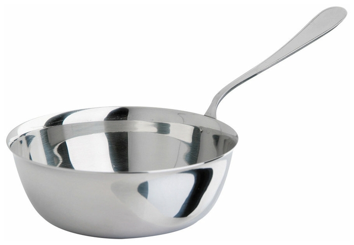La caractéristique du numéro de modèle 93-150 est qu'il est fabriqué en acier inoxydable avec un revêtement spécial qui empêche l'apparition de la corrosion. Il n'est pas sophistiqué dans sa forme, mais en même temps il est pratique à utiliser : il a un poids très léger, un volume de 150 ml et une résistance à la chaleur accrue, de sorte qu'il peut être placé à la fois dans un four conventionnel et à micro-ondes sans crainte. que la vaisselle est déformée. Il a un long manche fait du même matériau que le reste de l'escroc.Du fait que les ustensiles sont en métal, ils n'ont aucun décor pour des raisons de sécurité.