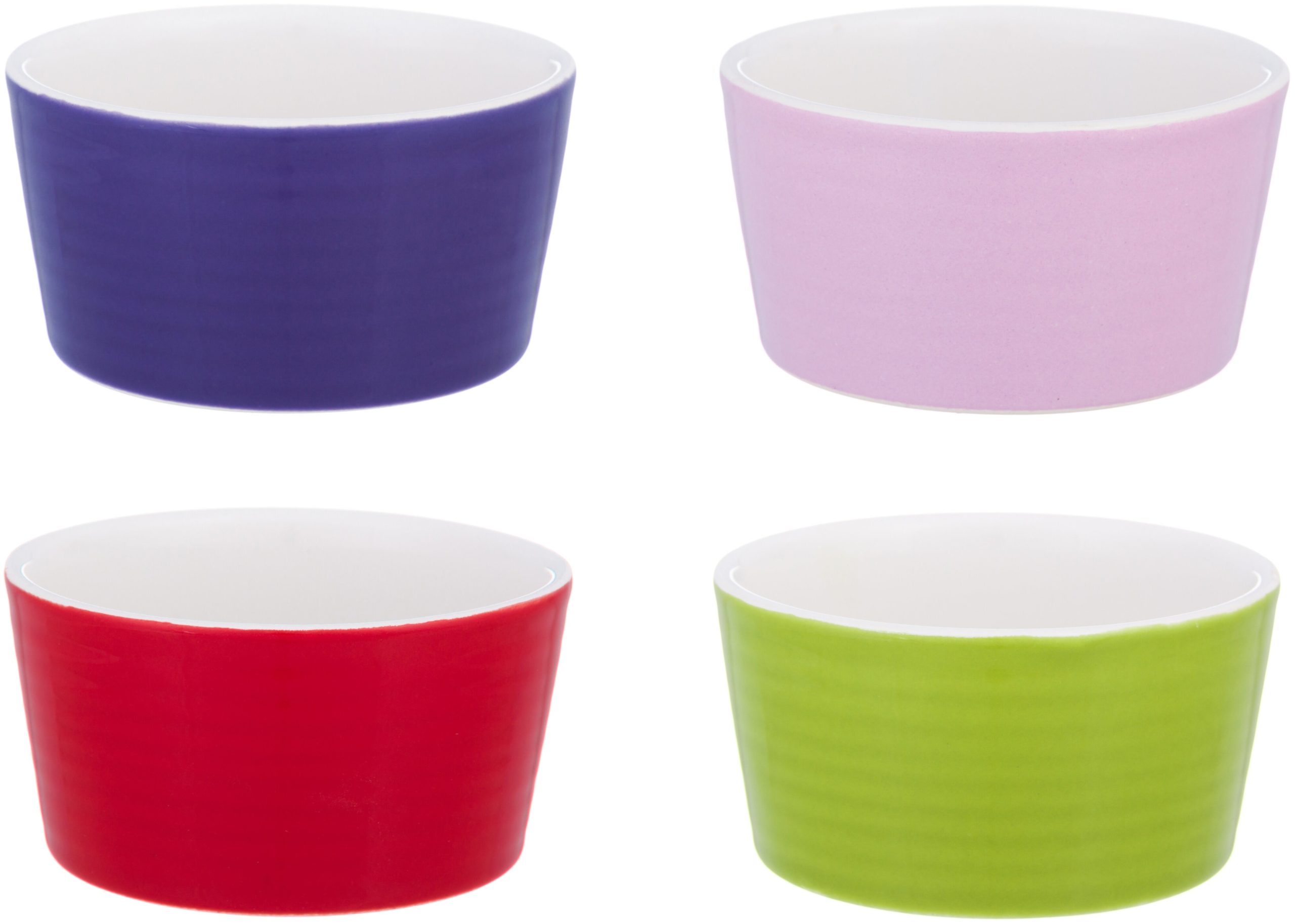 Le numéro de modèle 110858 est disponible en plusieurs couleurs - vert, violet, rouge et rose ; il n'a ni poignées ni couvercle, mais le paquet comprend 4 pièces à la fois. Fait référence au type de vaisselle en céramique, mais le consommateur peut ne pas avoir peur de le mettre au lave-vaisselle. Le rapport entre le diamètre et la hauteur est de 8,5 x 4,3 cm Le volume standard est de 150 ml.
