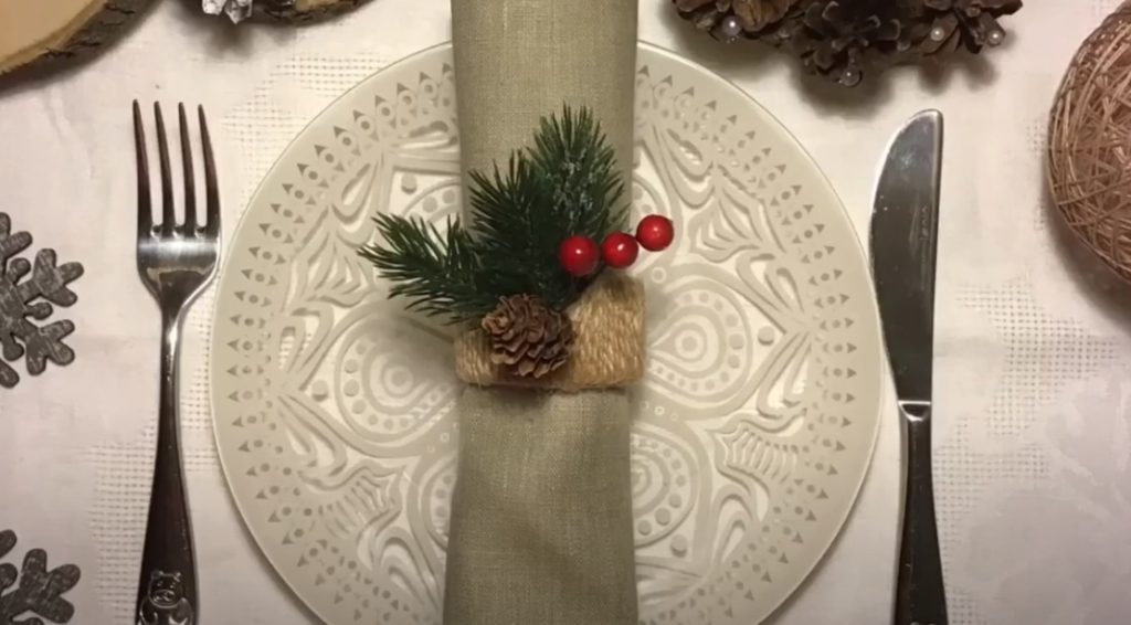 L'idée est d'utiliser des tubes épais en carton ou en plastique laissés par des films d'emballage usagés. Une telle base est sciée en anneaux de hauteur égale et soigneusement enveloppée de jute avec un ajustement constant. Ensuite, un motif simple du thème choisi est appliqué avec un pistolet à colle et après séchage, il est recouvert d'émail métallique. L'option convient aux fêtes de Noël et de Pâques, en parfaite harmonie avec les bougies, les branches de sapin, les motifs en argent et en dorure.