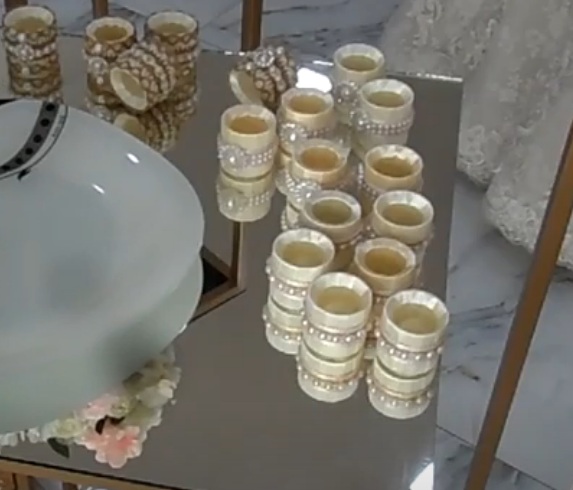 Une grande marge d'imagination est une variante du motif de strass. Le noyau est prélevé sur des serviettes en papier, découpées en bracelets de même hauteur. La couche inférieure est enroulée avec un ruban blanc ou de couleur pastel, suivi d'une constriction de couleur plus vive selon le ton de la portion. À l'aide d'un pistolet à colle, un motif créatif est appliqué à partir d'un ensemble de strass.