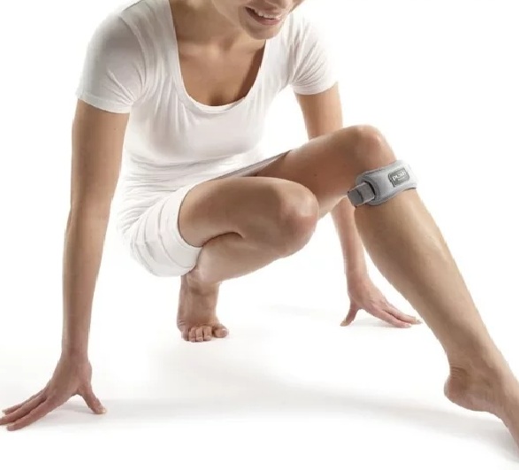Un brassard spécial fixé sur la jambe avec du spandex est une orthèse souple. L'anneau de fixation de la rotule est en silicone.