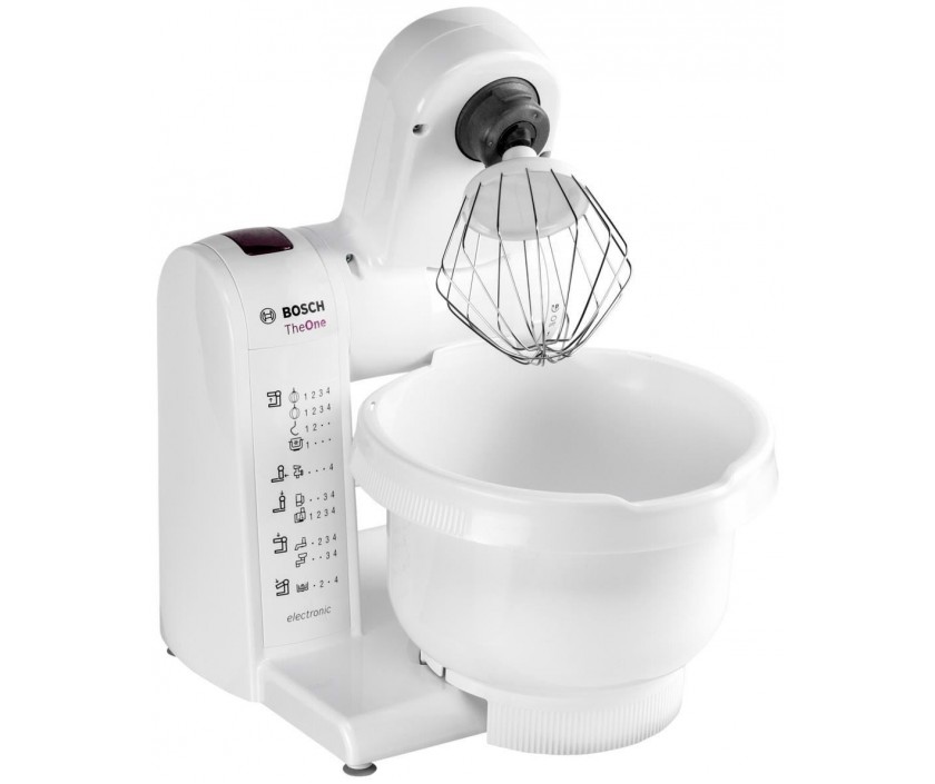 La puissance de l'équipement est de 550 W, la capacité du mixeur est d'un litre, le bol avec couvercle a un volume de 3,9 litres. Le modèle One MUM4657 remplace dans la cuisine : robot ménager, hachoir à viande et mixeur. Il dispose de 4 vitesses de rotation du crochet plus stationnement - repos. Un programme spécial surveille l'uniformité de la rotation, ne permet pas les secousses.