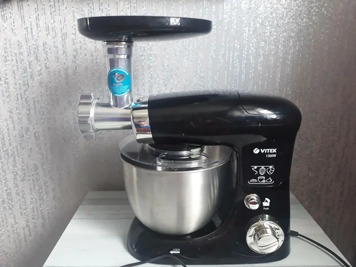 La puissance du VITEK VT-1440 est de 1300 watts. Il a une capacité de mélangeur de 800 ml. Capacité du bol - 4 litres. Nombre de vitesses - 6, avec réglage en douceur et rotation uniforme. Dans la cuisine, le modèle VT-1440 remplace plusieurs équipements : un mixeur, un hachoir à viande, une moissonneuse-batteuse pour pétrir la pâte, préparer de la viande hachée et préparer des produits pour d'autres plats.