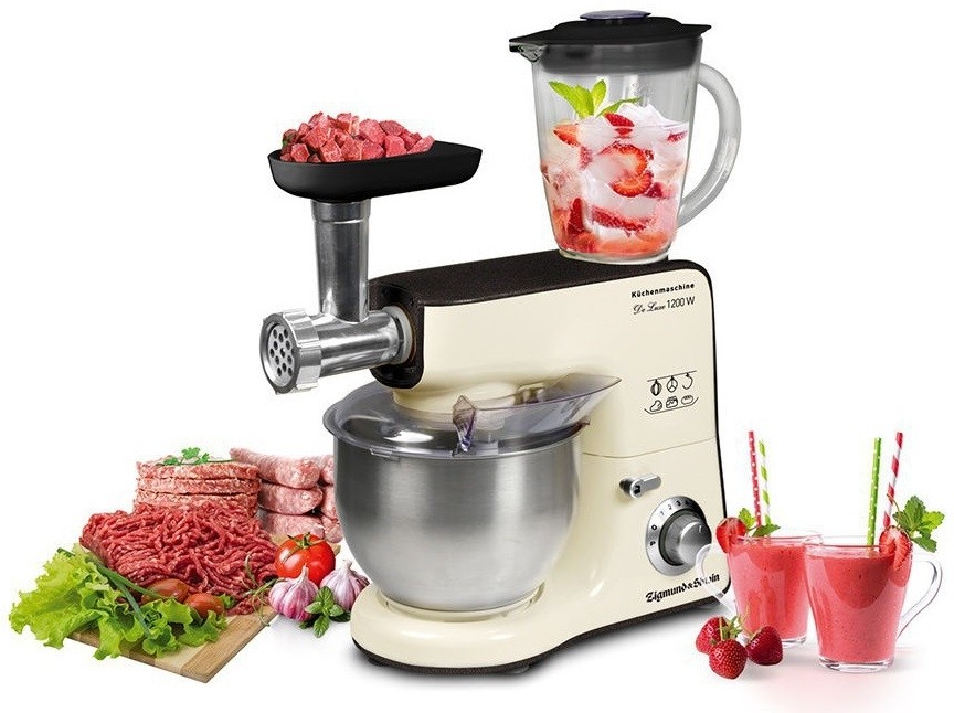 La puissance de l'équipement d'un fabricant étranger est de 1200 W, la capacité du bol est de 4,5 litres, le mélangeur est de 1,5 ml. le modèle ZKM-950 a 6 vitesses, un mouvement planétaire et un mode pulsé.Le hachoir à viande est multifonctionnel, possède une buse pour les saucisses, un couteau universel avec des trous de différentes tailles.