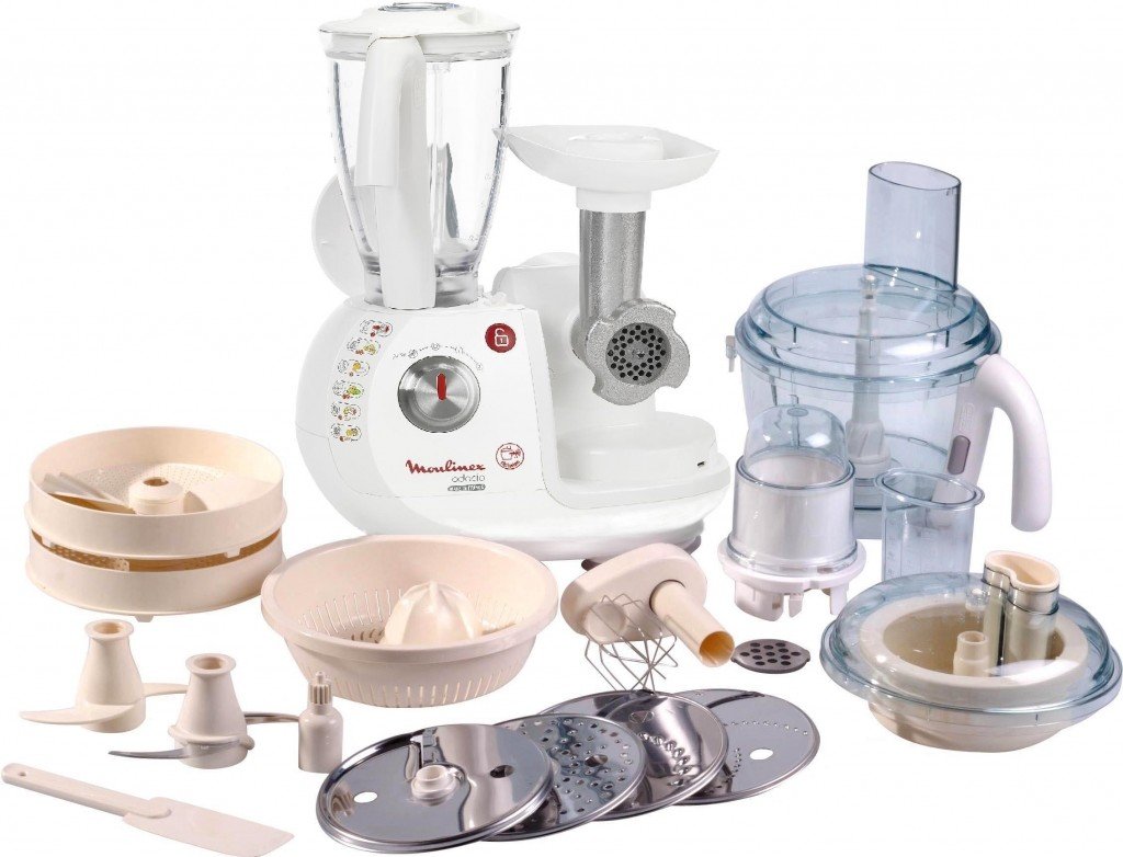 En plus de l'ensemble standard: mixeur, hachoir à viande, accessoire de pâte, le modèle comprend un broyeur, un mixeur, une râpe, un déchiqueteur.