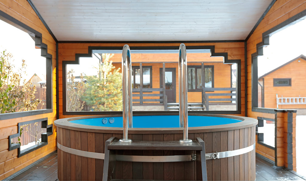 Le plus budgétaire du classement. Ce sont des récipients ronds en plastique avec des sièges intégrés qui peuvent être utilisés comme piscine d'été ou bain à remous.Il n'y a pas de chauffage, donc ceux qui aiment se plonger dans l'eau froide après un bain apprécieront cette option. Le conteneur est adapté pour une installation sur une base en béton sablonneux avec bétonnage ultérieur des murs. En finition - le même arbre, mosaïque, il existe de nombreuses options.