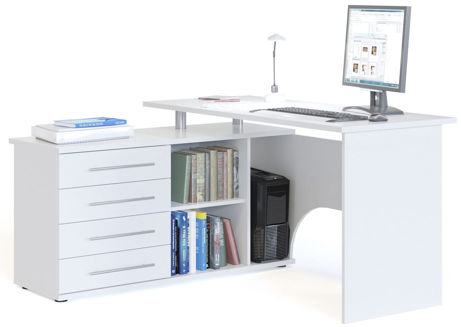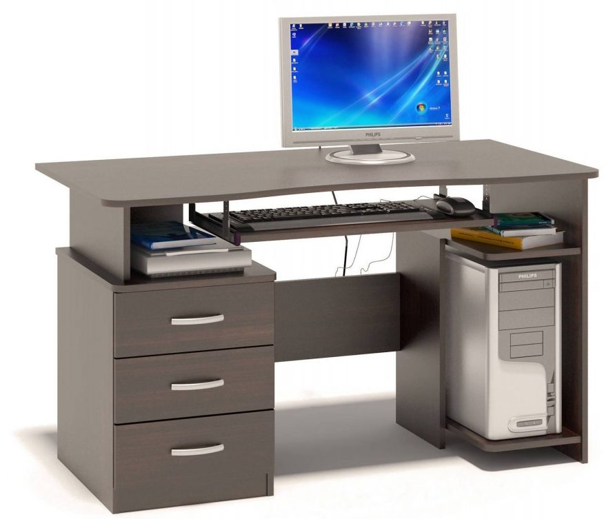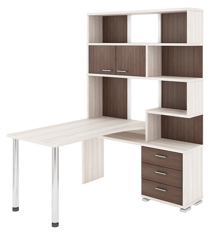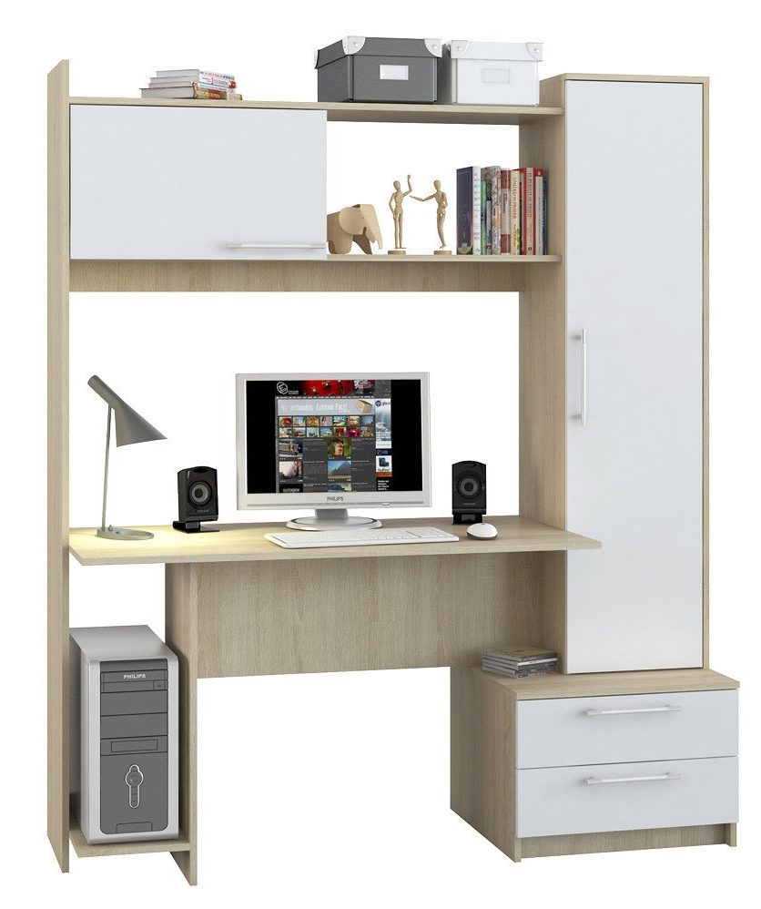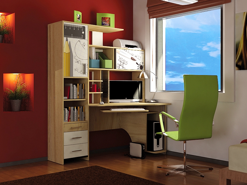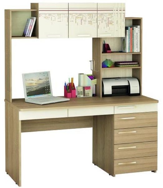 Petit mais spacieux, en aggloméré laminé, malgré sa taille, vous permet d'y placer tout ce dont vous avez besoin pour créer un espace de travail. Un moniteur est facilement localisé sur la surface, il y a des compartiments pour les documents et autres choses. En bas, il y a une plate-forme pour une unité PC, et il y a aussi une armoire avec des tiroirs. L'ensemble comprend une armoire avec quatre étagères et une superstructure avec des tiroirs ouverts et fermés.
