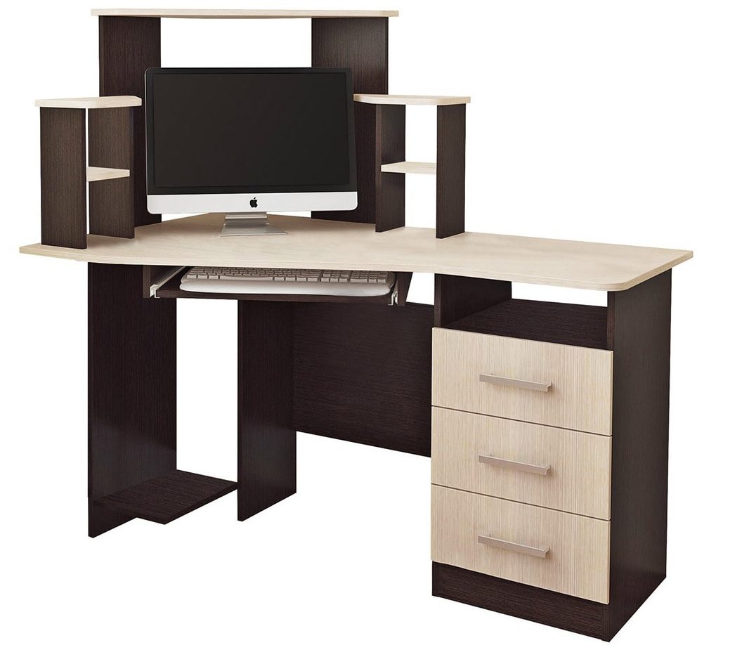 Un beau modèle de table d'angle, adapté au bureau, comporte deux plateaux, ce qui augmente considérablement la zone de travail. Une surface solide et volumineuse est en aggloméré laminé et vous permet de placer deux moniteurs de n'importe quelle taille en même temps, un plateau supplémentaire peut accueillir une petite imprimante ou des ustensiles d'écriture. Sous l'un des plateaux se trouvent des tiroirs pour ranger des documents et divers petits objets, y compris des fournitures de bureau. Un compartiment spécial est prévu pour l'unité centrale. Avant d'acheter, vous pouvez choisir l'emplacement souhaité du coin et des tiroirs. Les options de couleurs proposées par le fabricant vous permettent de choisir celle qui convient à l'intérieur, et l'assemblage est si simple que vous pouvez tout assembler vous-même sans l'aide d'assembleurs.