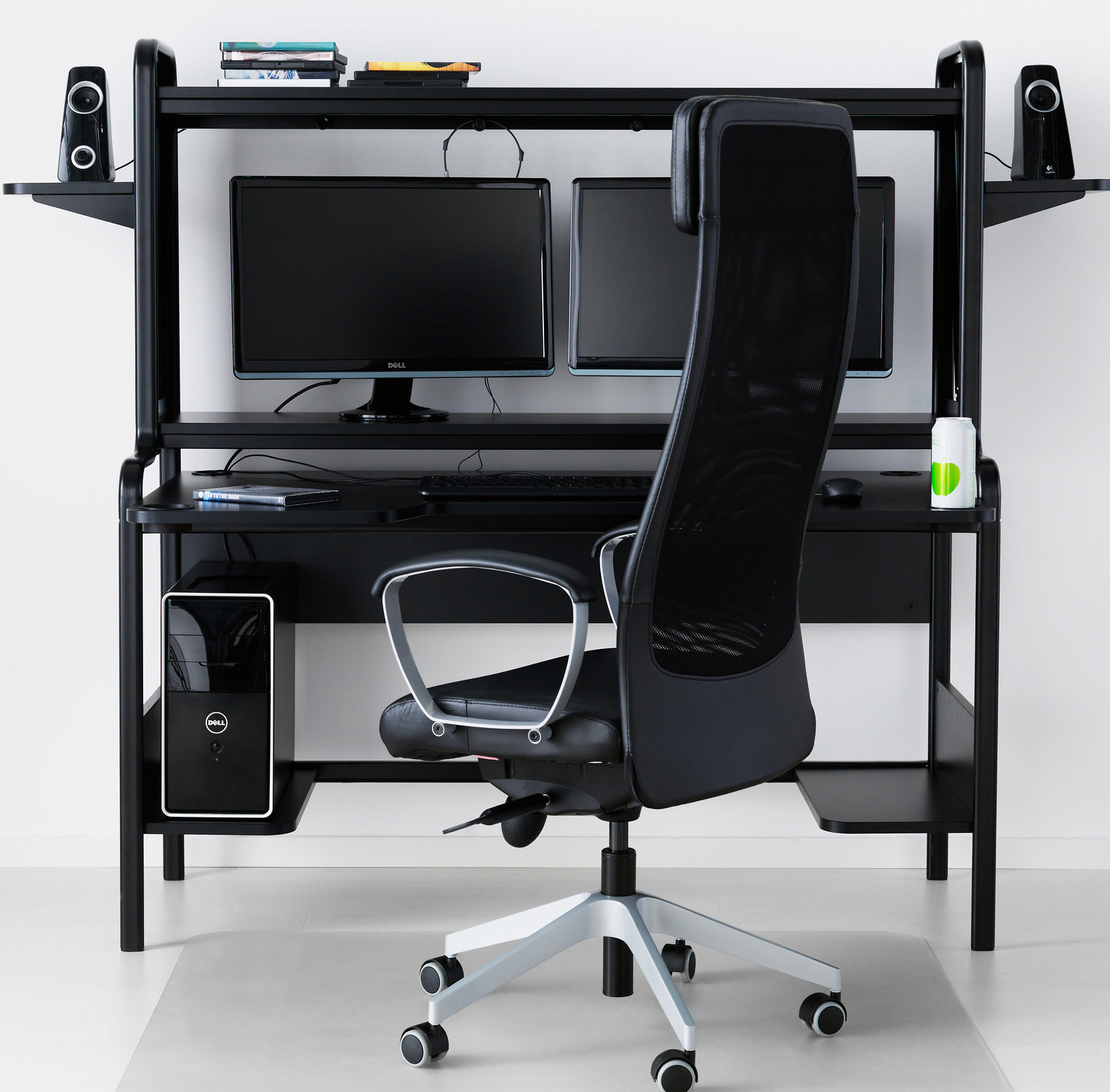 Le modèle Fredde est produit par l'une des entreprises les plus célèbres au monde ; des panneaux de particules et du métal sont utilisés pour sa fabrication. Les fabricants ont prévu les besoins des utilisateurs et ont équipé IKEA Fredde de deux modules complémentaires sous forme d'étagères, celle du haut est conçue pour accueillir de petits équipements de bureau et celle du bas peut installer un ou deux moniteurs en même temps. Si nécessaire, la tablette inférieure peut être retirée. Il existe également des étagères latérales, de petites tailles pour l'installation de haut-parleurs et un compartiment spécial pour l'unité centrale. Ils produisent des meubles en deux couleurs classiques, blanc et noir. Les porte-gobelets sont situés des deux côtés du plateau, ce qui est très pratique.