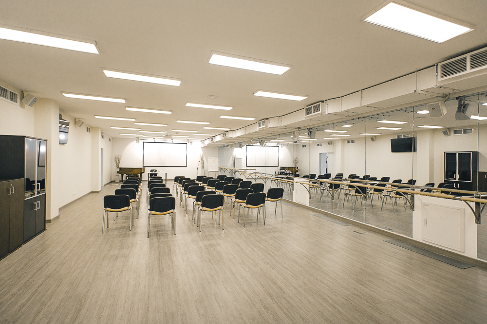 Chambre lumineuse, sans fenêtres, mais avec un mur en miroir. Capacité jusqu'à 160 convives selon les places assises. Le prix de location comprend : projecteur, écran, système de haut-parleurs, microphones, glacière, paperboard. Sur demande, moyennant des frais, un équipement supplémentaire peut être fourni - un ordinateur portable, une caméra vidéo, etc.