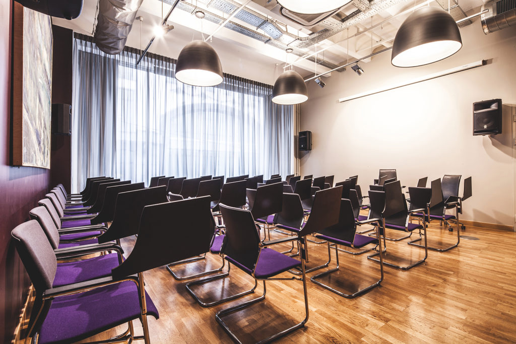 Un auditorium cosy d'une superficie de 32 m2 pouvant accueillir jusqu'à 25 personnes. Éclairage lumineux réglable, 2 options de sièges.