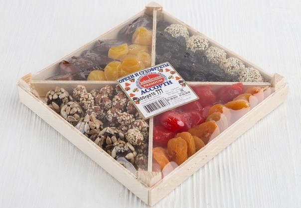 Un bel emballage (carton avec corde de jute) est parfait comme cadeau pour toutes les vacances pour enfants ou adultes. Des ingrédients sains à l'intérieur comme à l'extérieur. C'est un produit végétarien. Fruits secs : carottes, figues, canneberges. Poids : 300 grammes. Marque : Belca. Prix moyen : 540 roubles.