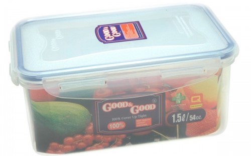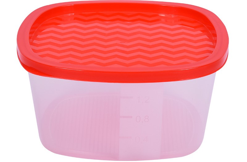 Le récipient rectangulaire contient 1,6 litre. 4 loquets sécurisés sécurisent le conteneur. Vous pouvez chauffer les aliments au micro-ondes, pendant que vous devez retirer le couvercle et chauffer pendant 3 minutes maximum. Dimensions : 14x20x10 cm.Production nationale. Coût moyen : 460 roubles.