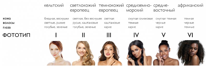En fonction de cette caractéristique, le degré de protection est sélectionné. La figure montre clairement 6 phototypes selon Fitzpatrick : la couleur caractéristique de la peau, des cheveux, des yeux.