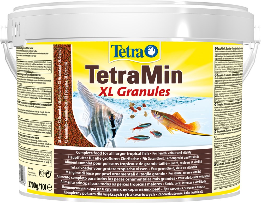Il a une forme granuleuse, conçue pour nourrir les gros poissons d'eau douce. De petits emballages en plastique et des seaux de 10 litres sont produits.