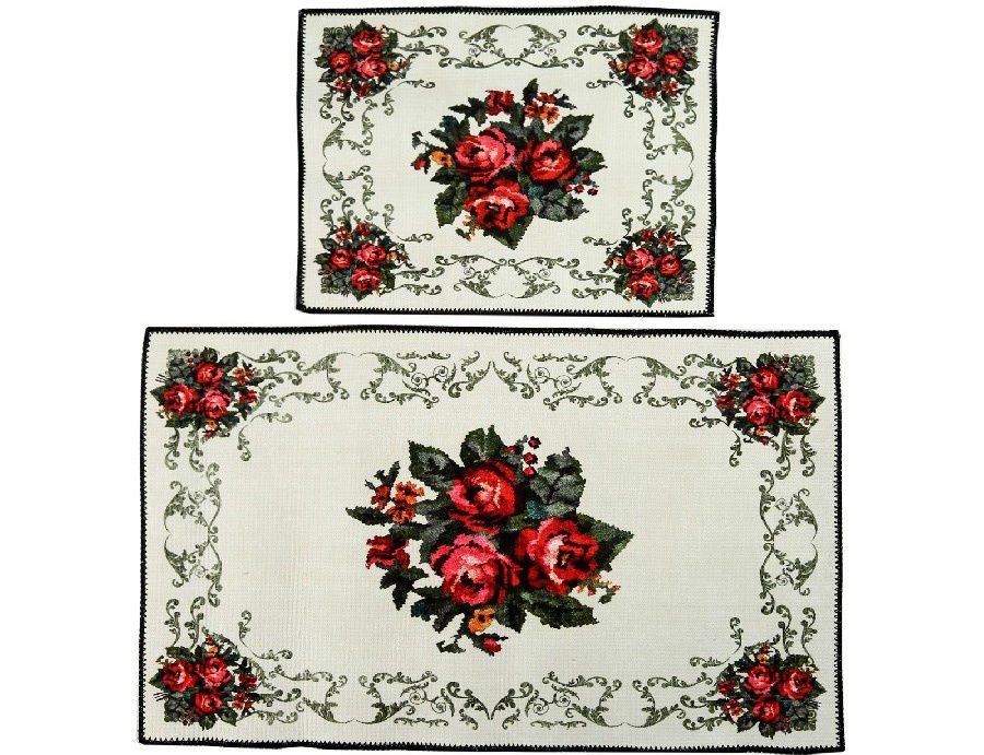 Ensemble en polyester avec imprimé brillant.Les bords sont superposés, de ce fait ils ne s'effritent pas et ne se replient pas (se soulèvent) pendant le fonctionnement. D'en bas, il n'y a pas de base antidérapante, mais en même temps, ils s'adaptent parfaitement à la surface du sol. Pays d'origine : Turquie. Poids : 1,2 kg. Coût : 4612 roubles.