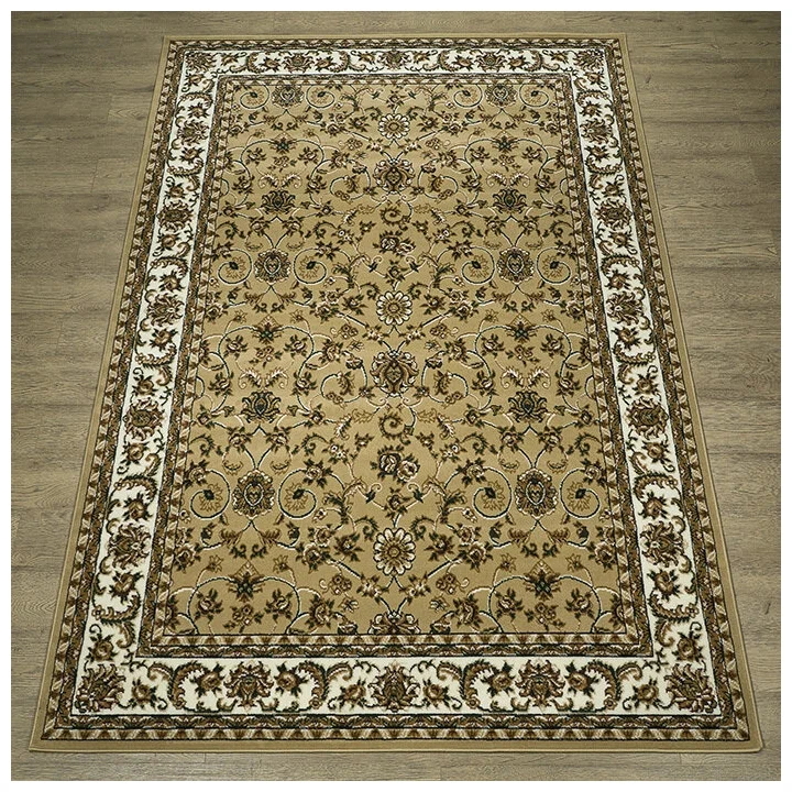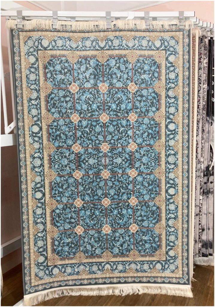 Le tapis persan est produit en Iran à l'aide d'une technologie de machine moderne. Le modèle a un poil court. Le dessin est un ornement avec des volutes. Le matériau de la couverture est en polyester. Le tapis peut être lavé et nettoyé de n'importe quelle manière. Ne se décolore pas. Convient pour le salon et la chambre. A l'air bien sur un canapé ou un lit. Le coût est de 13 000 roubles.