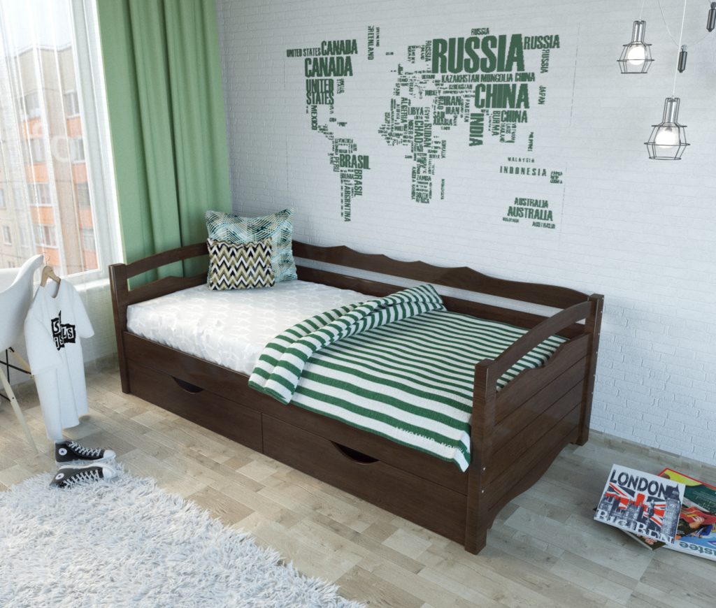Ce modèle de lit pour adolescent est un lieu de couchage confortable dont les dimensions sont de 190x80 cm, cette taille convient à un enfant et à un adolescent. Delta 19 présente un design élégant et discret qui s'adapte à tout type d'intérieur de chambre. Le produit est composé de panneaux de particules stratifiés et est complété par deux tiroirs spacieux pour ranger le linge de lit ou les jouets. Cette solution pratique vous permet d'économiser de l'espace libre dans la pièce. De plus, Delta 19 est équipé d'un côté qui est responsable du sommeil en toute sécurité de ceux qui se tournent et se retournent pendant leur sommeil. La base du produit est solide. Vous pouvez choisir parmi plusieurs options de couleur pour le boîtier et la façade des tiroirs : texture bois naturel, orange vif, bleu, rose et vert clair.Le coût moyen est de 6 730 roubles.