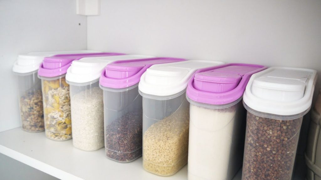 Pour les céréales, les spaghettis, les pâtes et autres produits en vrac, des récipients spéciaux sont fabriqués - généralement de couleur transparente, équipés d'un couvercle pratique pour verser les produits. Le matériau de fabrication peut être du plastique, du verre, du métal. Il est pratique de stocker les céréales dans de tels bocaux - les couvercles hermétiques ne permettent pas à l'humidité et à la poussière de pénétrer.