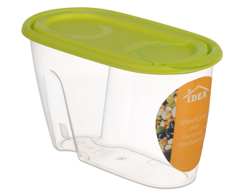 Conception suffisamment pratique pour stocker les céréales et autres produits en vrac. Il y a un distributeur sur le couvercle, avec lequel il est pratique de verser le produit dans un autre récipient pour sa préparation ultérieure. Sur la partie principale, il y a une échelle de mesure, que toute femme au foyer appréciera.