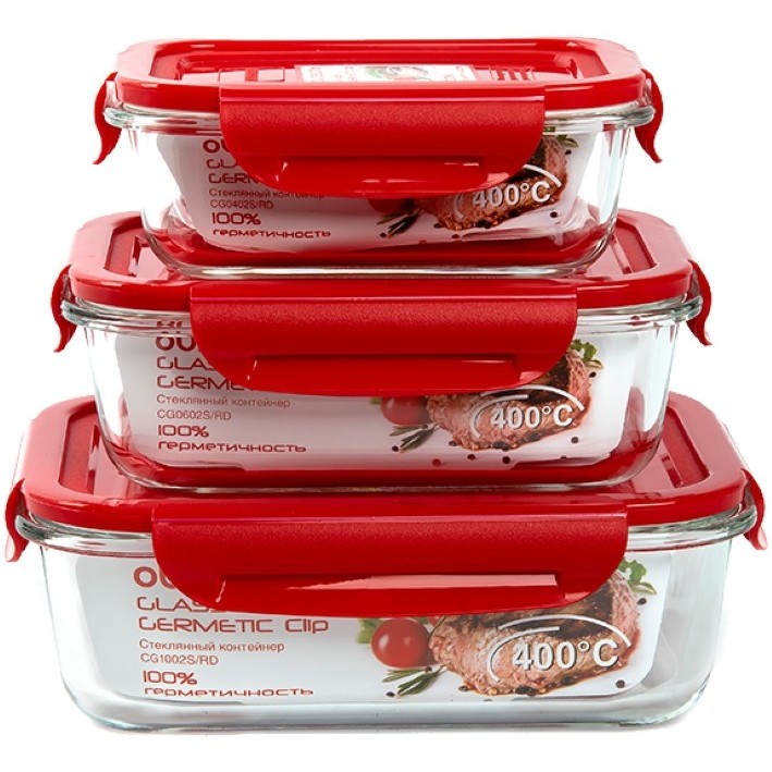 L'ensemble se compose de trois articles avec des volumes de 350 ml, 630 ml et 1,04 litre.Chacun d'eux est équipé d'un couvercle scellé, sur lequel se trouvent les loquets.
