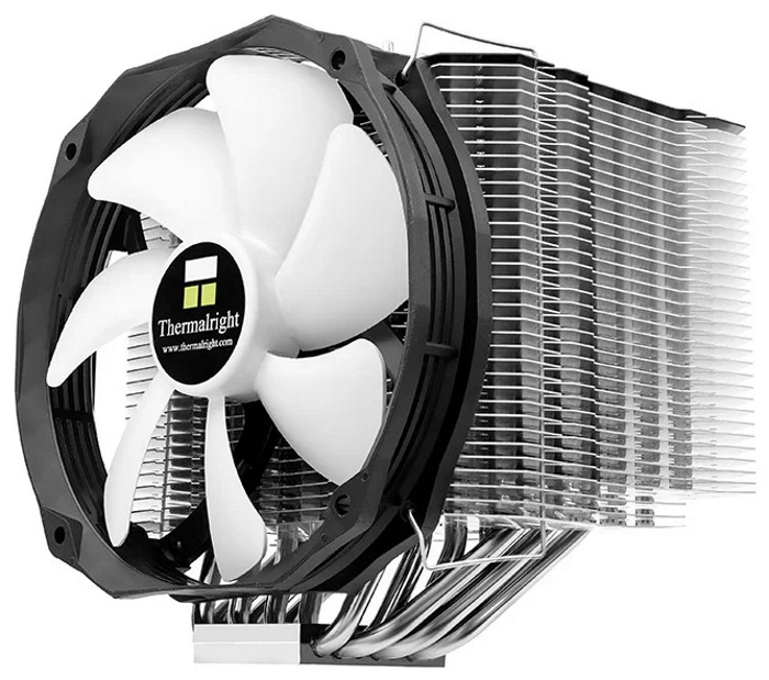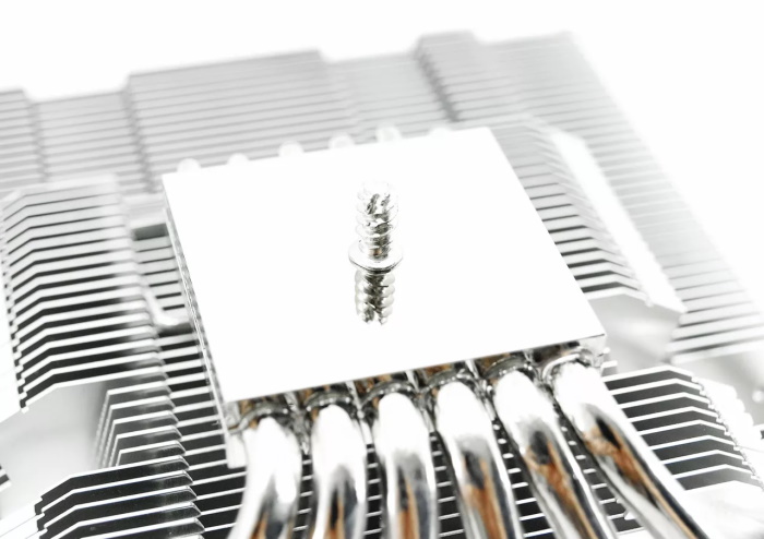 Un produit polyvalent de type tour capable de fonctionner en mode passif. Malgré ses dimensions, il peut être facilement placé sur n'importe quelle carte mère sans chevaucher les fentes supérieures en raison de sa forme asymétrique. La composition comprend un radiateur à sept tubes nickelés, sur lesquels sont enfilées 35 plaques d'aluminium d'une surface de dissipation totale de près de 12 000 cm².