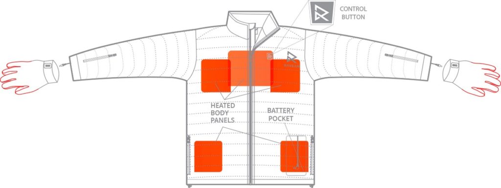 Comme mentionné ci-dessus, les produits en question intègrent des panneaux ou plaques chauffants cousus, qui, en chauffant, transfèrent la chaleur de la veste au corps humain. Les panneaux fonctionnent à partir d'un connecteur USB lorsqu'une banque d'alimentation est connectée, bien qu'une autre source d'alimentation puisse être fournie. Ils peuvent différer à la fois par leur puissance et par leur nombre, c'est-à-dire le nombre de plaques cousues dans une veste / gilet séparé. Il convient de noter l'efficacité de ces plaques chauffantes - une banque d'alimentation d'une capacité de 10 000 mAh couvrira complètement 6 à 8 heures de fonctionnement en mode économique, et en mode amélioré, elle durera 3 à 5 heures (ce qui dépendra de la zone de chauffe et le nombre d'éléments de travail).