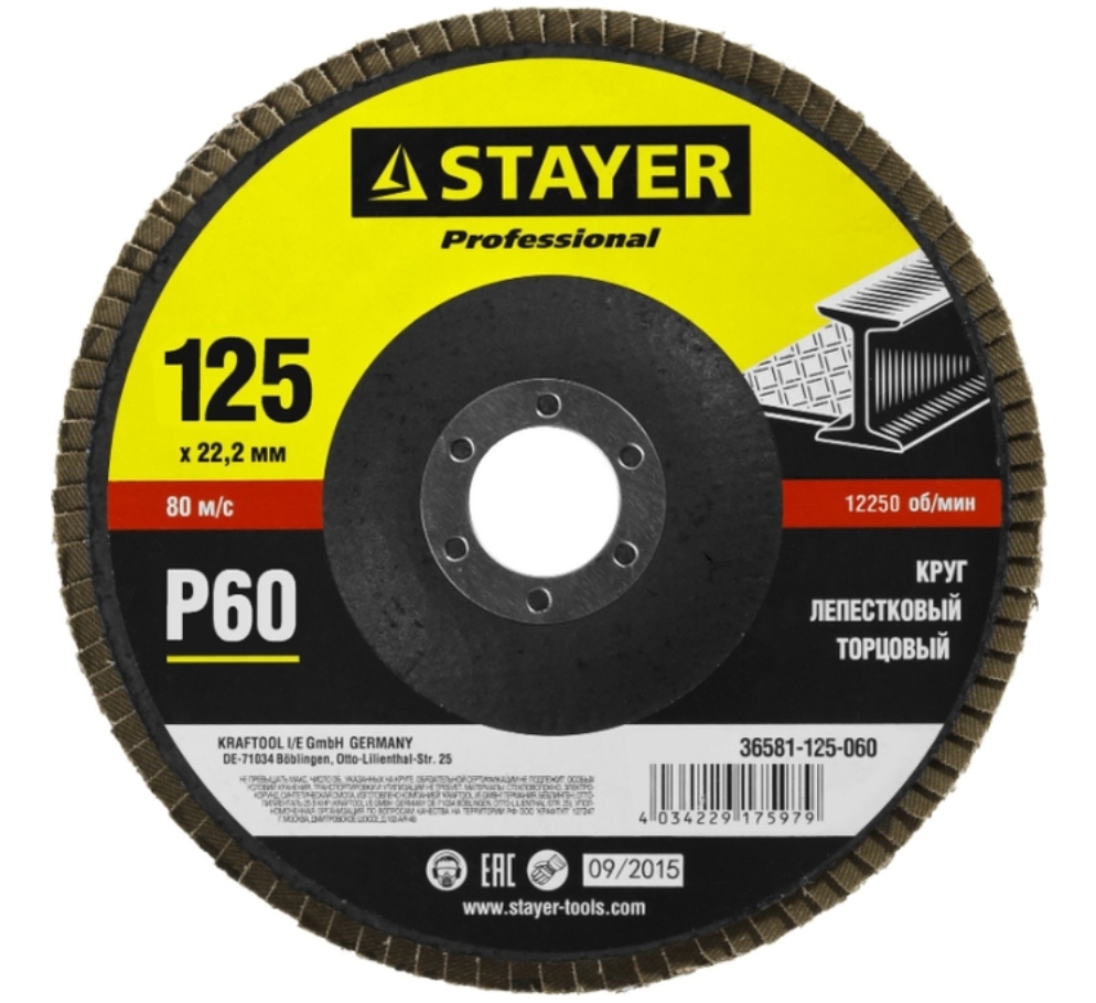 "Stayer 36581-125-060" est une meule d'extrémité pour bois, métal pour "meuleuse", utilisée pour le meulage préliminaire et intermédiaire des métaux, des soudures et du bois. La méthode électrostatique du dessin assure la distribution uniforme de l'abrasif sur toute la surface ouvrière. La base en tissu élastique vous permet de meuler des pièces complexes. En raison de la structure spéciale des lamelles, la qualité et la vitesse de traitement sont considérablement améliorées.