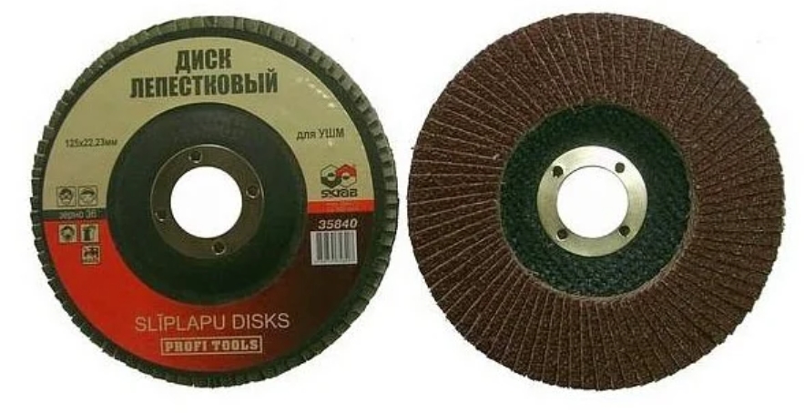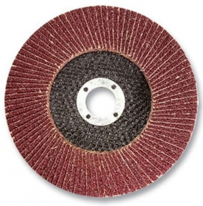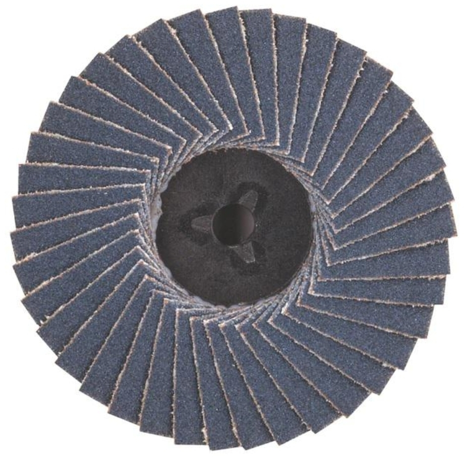 Les disques à lamelles sont constitués de lamelles abrasives à base de tissu en forme d'éventail autour d'un support central. Il est fait de fibre de verre. En raison de la disposition radiale des lamelles, une grande élasticité de la surface de travail du produit est obtenue, ce qui augmente considérablement la productivité par rapport aux autres outils. La position spéciale du matériau abrasif contribue à son refroidissement pendant le fonctionnement, assurant un meulage à froid. Le nombre maximal de tours par minute est de 13300 tr/min.