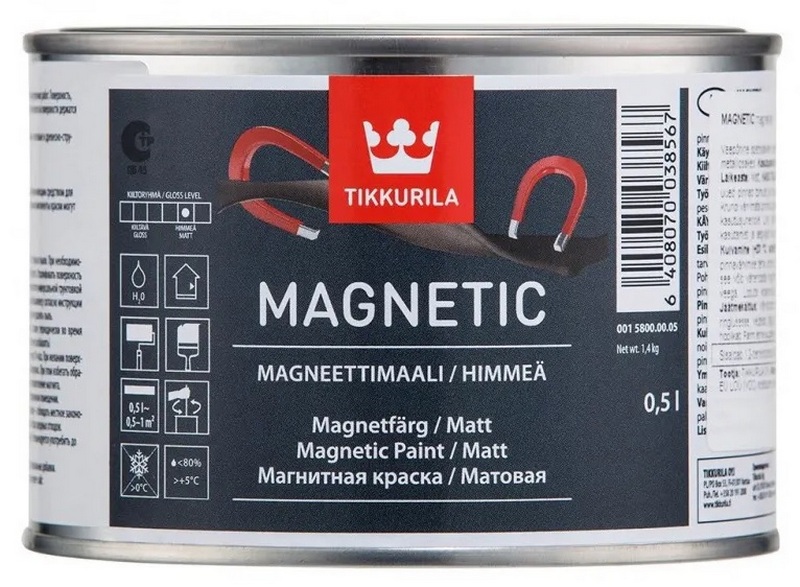 La composition est appliquée sur n'importe quelle surface: béton, contreplaqué, aggloméré, OSB ou GKL, murs, bois, plastique. Il a une couleur gris foncé, est fabriqué à base de dispersion de latex, comprend des copeaux de métal, grâce auxquels des aimants sont fixés à la surface. Il est pratique de l'utiliser dans les bureaux, les cafés, les jardins d'enfants, à la maison (lors de la décoration des chambres d'enfants, des cuisines). La peinture est capable d'étouffer le rayonnement électromagnétique des appareils électroménagers en état de marche, ce qui est important si un petit enfant vit dans la maison. Le coût recommandé pour les chaînes de magasins est de 873 roubles.