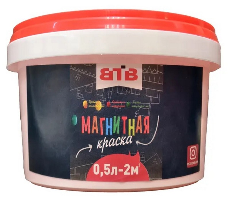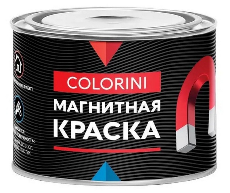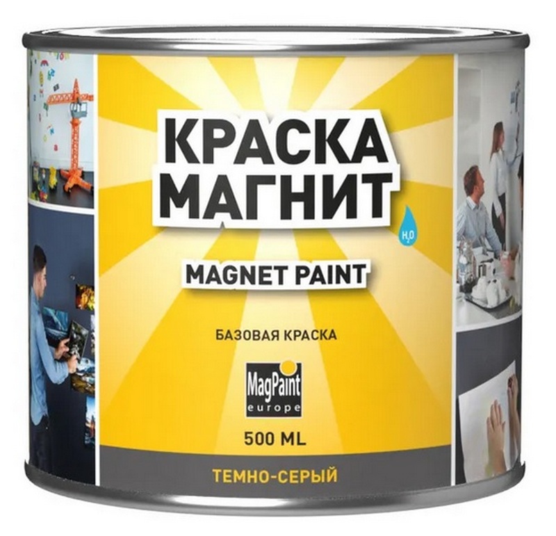 La peinture est utilisée pour créer un revêtement sur lequel les aimants sont attirés, sur des surfaces en béton, plâtre, mastic, contreplaqué, panneaux de fibres, panneaux de particules, plaques de plâtre, plaques de plâtre. La composition de la peinture est faite sur de l'acrylate pur importé, contient de la poudre métallique, vers laquelle les aimants sont attirés, elle convient comme base pour les peintures intérieures, y compris le marqueur et l'ardoise, tout en conservant les propriétés magnétiques. Le revêtement liquide noir mat monocomposant est immédiatement prêt à l'emploi, il est possible de dessiner à la craie, il est également possible d'appliquer de la peinture ardoise par-dessus d'autres couleurs. C'est un matériau à base d'eau pour des applications spéciales à l'intérieur et à l'extérieur. Le coût recommandé pour les chaînes de magasins est de 1050 roubles.