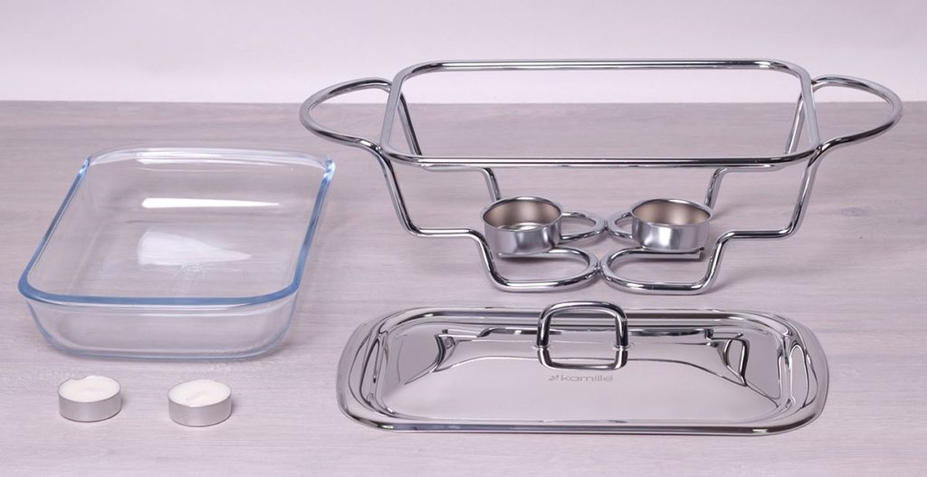 Fabriqué en Pologne Kamille Food Warmer KM-6412 est un récipient rectangulaire d'un volume de 1,5 litre.Il est placé sur un support spécial et équipé d'un chauffage. C'est l'une des solutions les plus optimales pour servir une table de fête, car elle maintient parfaitement la température des plats chauds.