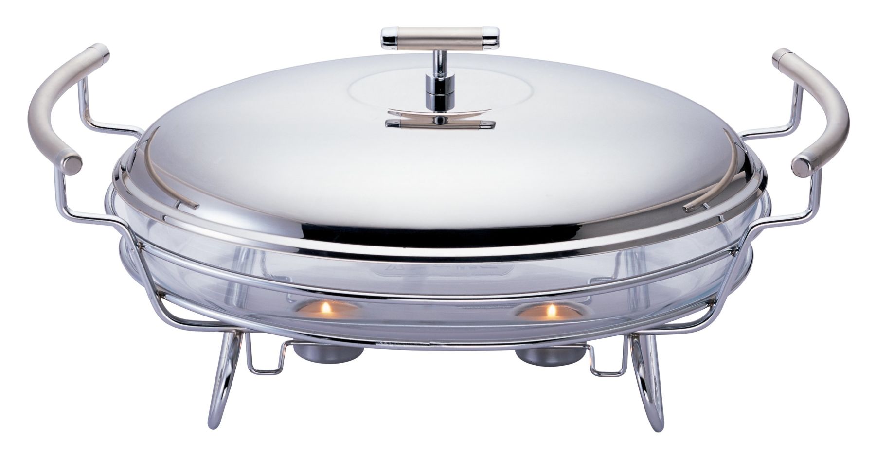 Un récipient de trois litres avec un couvercle est monté sur un support en acier inoxydable. Le bol lui-même est en verre SABINEX résistant à la chaleur (fabricant français, qui garantit le fait que le récipient ne formera aucune réaction chimique avec la vaisselle, c'est-à-dire qu'il n'affectera pas les caractéristiques gustatives des produits ou plats qui y sont stockés ). Il a une forme ovale visuellement attrayante. Cela vous permet de l'installer directement sur la table sans perturber l'harmonie du service. Les bougies sont déjà incluses. Dans ce cas, le récipient peut être facilement installé dans un four à micro-ondes ou un réfrigérateur.