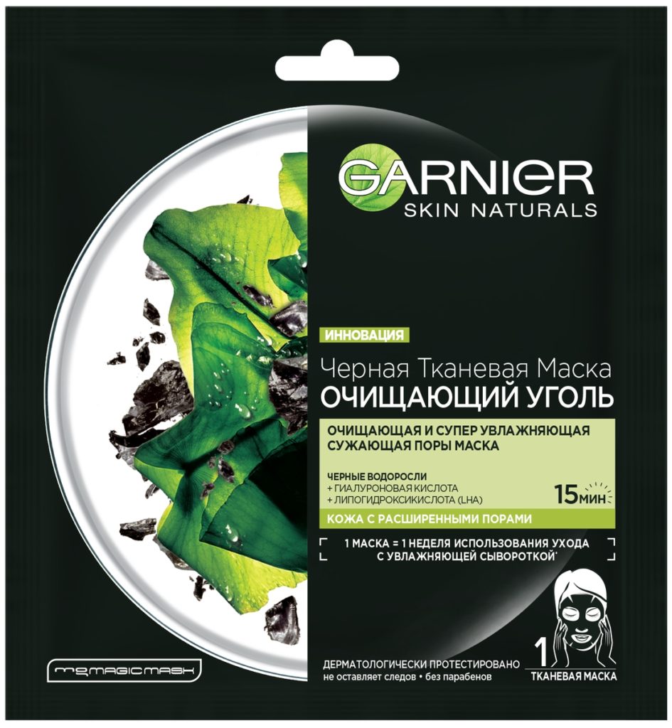 Masque en tissu aux algues noires et au charbon actif. La texture liquide, dont le tissu est imprégné, pénètre activement dans le derme et commence à agir immédiatement après l'application.Durée active : 15 minutes. Pas besoin de rincer après utilisation, le résidu doit être massé dans la peau. Pays de fabrication : Allemagne. Prix moyen : 136 roubles.