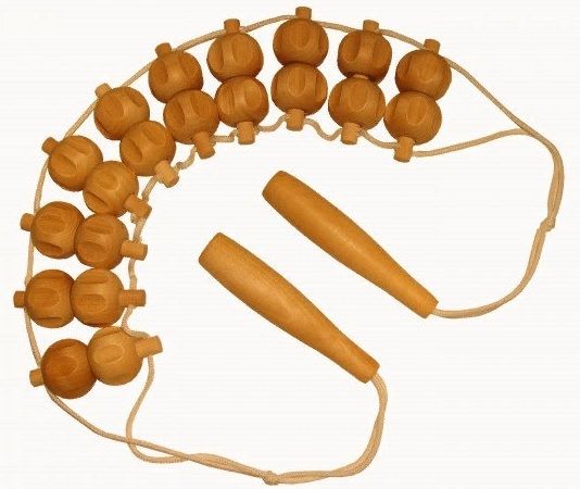 Appareil en bois avec poignées, permet de masser toute la zone du dos. Il se compose de deux types d'éléments de massage : des rouleaux longitudinaux et à picots, de sorte que lors de l'utilisation de la structure, des efforts physiques peuvent être appliqués sur les zones molles situées des deux côtés de la colonne vertébrale.