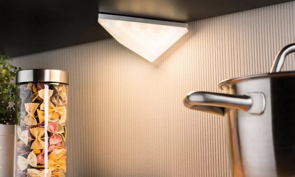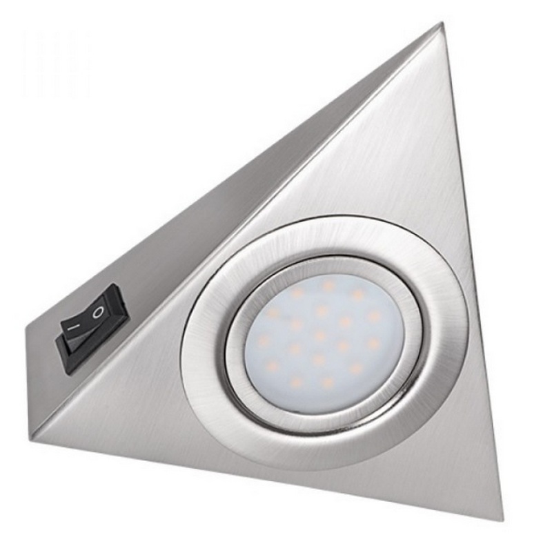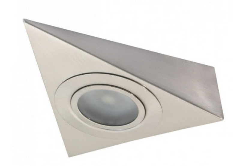Ce produit triangulaire est directement recommandé par le fabricant pour une utilisation en conjonction avec des ensembles de cuisine. Vous pouvez l'utiliser comme rétro-éclairage pour un évier ou une zone de travail séparée (par exemple, une table pour couper les aliments). L'équipement standard comprend des sources de diodes intégrées de lumière froide douce (afin qu'il n'y ait pas d'éblouissement sur les parties métalliques des meubles de cuisine), et le contrôle est effectué au moyen d'un interrupteur à bascule. Le modèle se connecte facilement aux systèmes "smart home", il peut être équipé de détecteurs de mouvement. Le boîtier est en acier chromé et est bien scellé selon la 65ème classe de protection (résistant à l'humidité). Le coût recommandé pour les chaînes de magasins est de 549 roubles.