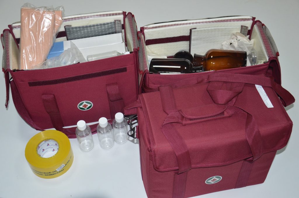 Le sac d'une sage-femme, comme celui d'une infirmière, doit être spacieux, fonctionnel et spacieux. Matériel et fournitures jetables de base (kit d'injection, kit de perfusion de liquide de perfusion, kit de pansement et kit chirurgical de base, kit de protection contre les infections), kit anti-choc, tensiomètre, stéthoscope, tube obstétrical, tests de glycémie, kit de désinfection et de désinfection, trousse de soins pour nouveau-né, trousse d'accouchement d'urgence.