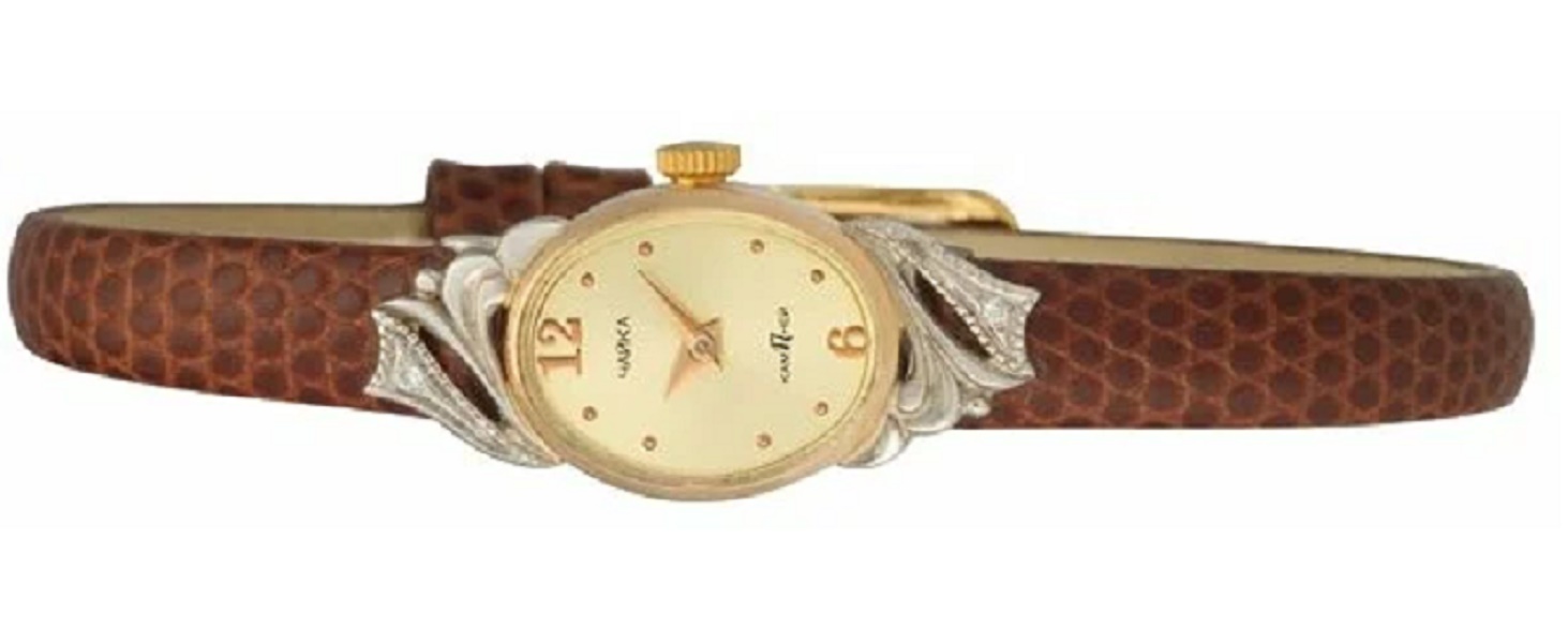 Le modèle de l'usine horlogère d'Uglich n'est pas seulement un accessoire féminin moderne. La mouette est un véritable bijou. Boîtier en or, inserts en zircone cubique, bracelet en cuir véritable donnent aux horloges pour femmes un style rétro luxueux. Dans le même temps, le mécanisme de la montre est précis et fiable.