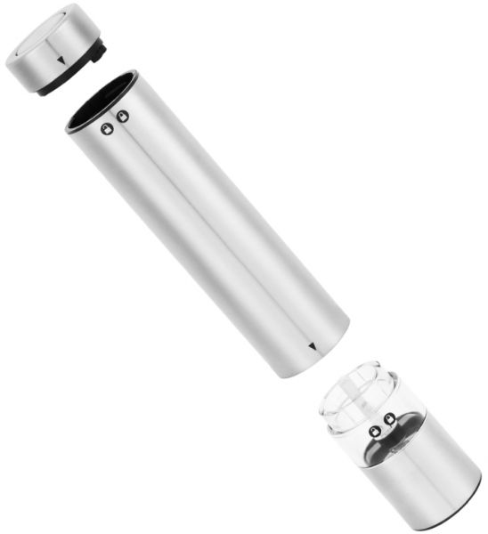 De l'acier de haute qualité a été utilisé pour fabriquer le corps du moulin électrique. Les fenêtres transparentes sont en plastique et les meules sont en céramique. Capacité - environ 40 grammes de poivre. L'alimentation est fournie par 6 piles. Facile à utiliser, pour commencer, vous devez appuyer sur le bouton sur le dessus. Pratiquement silencieux. En bas, il y a une lumière avec une agréable nuance de bleu, ce qui aide à mieux voir la quantité d'épices moulues. Le coût moyen est de 1 146 roubles.