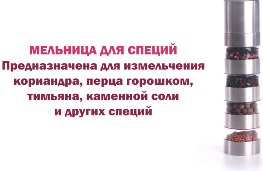 Le corps du moulin électrique est en métal fiable et solide, et les meules sont en céramique. Vous pouvez choisir le degré de broyage. Pendant le fonctionnement, le produit broie et distribue simultanément des épices. Il est très simple à utiliser, vous devez maintenir la technique au-dessus du plat et appuyer sur le bouton. Hauteur du produit - 18,2 cm, largeur - 3,3 cm. Le coût moyen est de 1 140 roubles.