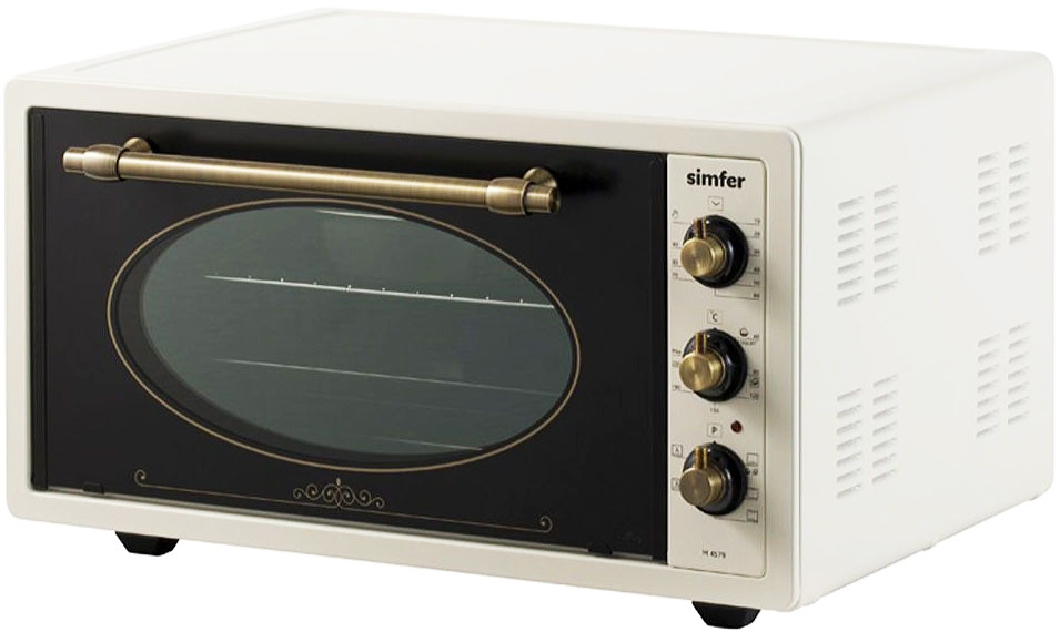 Un four électrique inhabituel d'un fabricant turc. Le Simfer M4579 est de style rétro avec des boutons rotatifs de style bronze. L'intérieur du four est recouvert d'émail et équipé d'un éclairage.Malgré ses dimensions compactes, cet appareil multifonctionnel n'est que légèrement inférieur à un poêle en termes de capacités. La capacité est de 45 litres. La chaleur supérieure et inférieure offre 5 modes de fonctionnement :