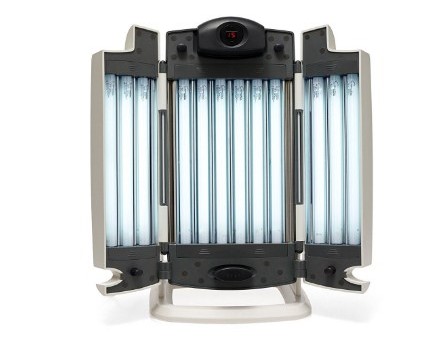 L'appareil pour le bronzage complexe de la zone du visage et du décolleté est pratique, pratique et fiable. La puissance moyenne de 200 W permet d'obtenir la teinte bronze tant convoitée sur le visage, le cou et le décolleté en plusieurs séances. 12 lampes UV avec réflecteur durent longtemps, font un excellent travail. L'appareil est populaire en raison de son efficacité, de sa durabilité, de sa compacité: il est fabriqué selon le principe du treillis, les sections latérales se plient facilement, ce qui permet un rangement pratique n'importe où, même dans un petit appartement. Une minuterie mécanique jusqu'à 30 minutes vous permet de contrôler le temps, la fonction d'arrêt automatique vous avertit de la fin de la session. Le produit est garanti un an.