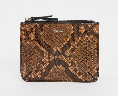 Le modèle à imprimé animalier est très apprécié parmi les produits de la marque.Malgré le prix élevé - 3990 roubles, il est souvent acheté dans les magasins en ligne. La face avant comporte le logo de la marque. Le cuir de veau est teint dans les tons du bois naturel. Il se ferme à l'aide d'une fermeture éclair, ce qui assure la sécurité du contenu : argent métallique et cartes de crédit.