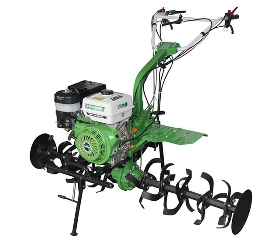 L'appareil est équipé d'un système de démarrage du moteur amélioré et d'une transmission par chaîne fiable, d'un boîtier en acier solide pour protéger la boîte de vitesses. Au cœur de la machine se trouve un moteur à essence à quatre temps OHV de 7 chevaux avec une consommation de carburant modeste. Ce n'est que 360 grammes pour une heure de travail. La boîte de vitesses est à trois rapports, dont un en marche arrière et deux en marche avant.