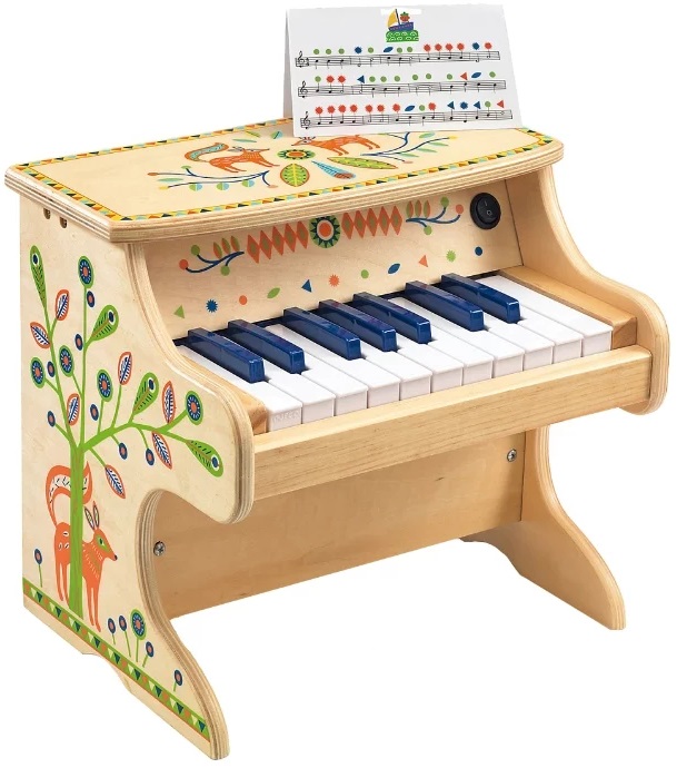 Beau piano en bois. L'instrument est laqué et orné d'un délicat motif d'animaux des bois et de divers motifs, et dispose de 18 touches avec lesquelles vous pouvez jouer une mélodie. Il fera un excellent ajout à toute collection de jeux. Le piano favorise le développement de la motricité fine des mains, des habiletés tactiles, développe le sens du rythme et l'oreille musicale.