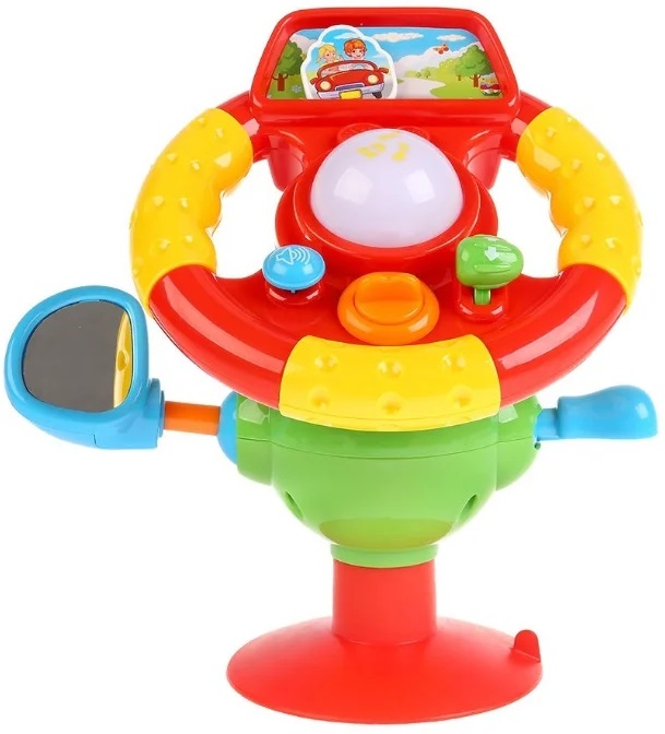 Le jouet se distingue par son design original en forme de volant. C'est ce qui attire son attention. Il contient des sons de voiture réalistes et des éléments mobiles pour améliorer la motricité de la main. Se fixe facilement sur une surface plane avec une ventouse.